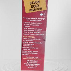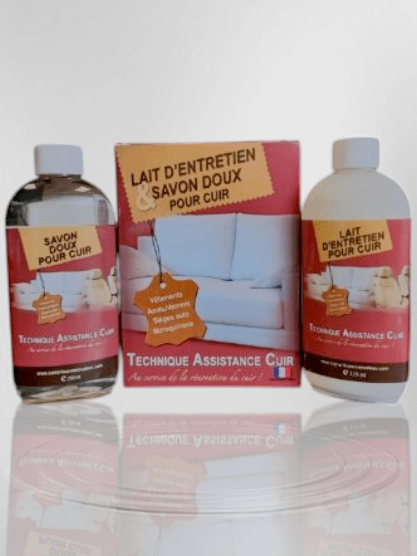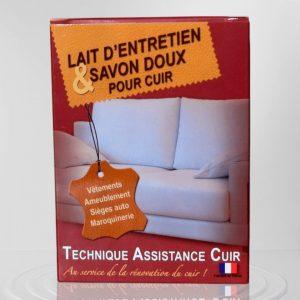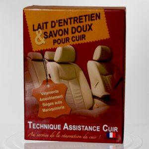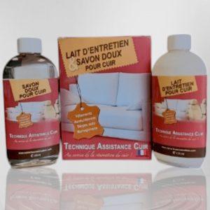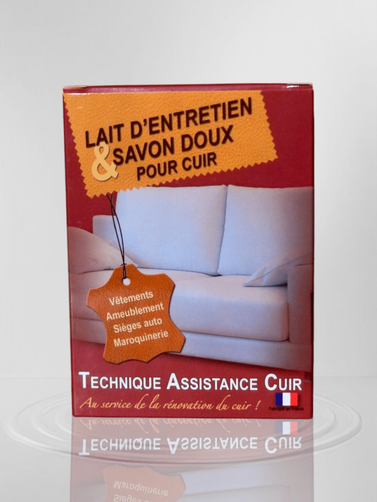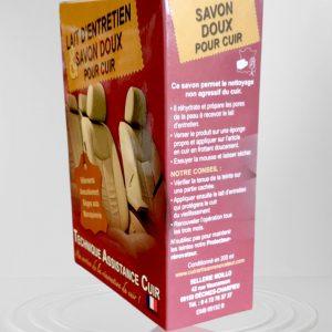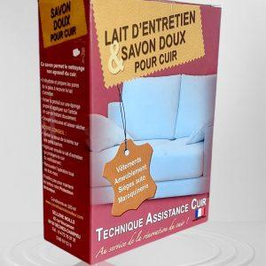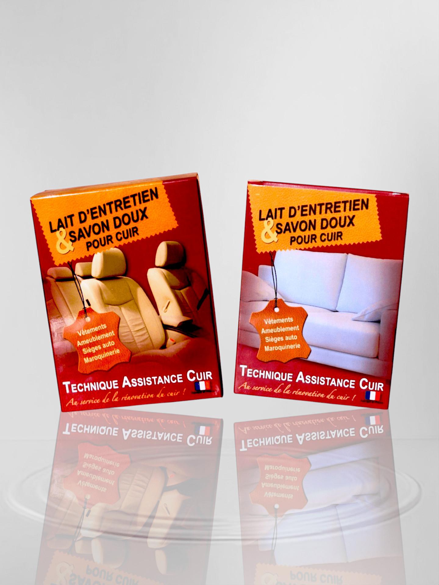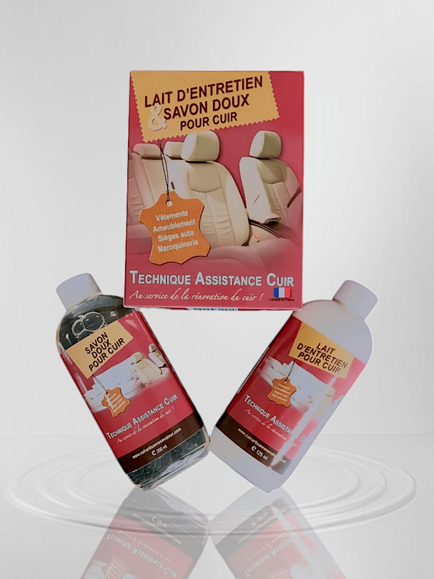 Coffret d’entretien pour cuir comprenant un savon doux et un lait nourrissant. Le savon doux nettoie en profondeur et réhydrate le cuir, tandis que le lait d’entretien nourrit.